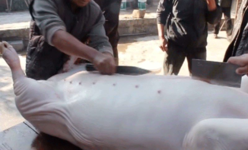 Last day of the Lunar calendar, Er Ge prepares the tail and head of the enormous pig he killed a few weeks ago, the one Emi filmed (above) just after she arrived at Lashihai. Scraped and washed, they await some more surgery then get a hot steamy bath till dinner.